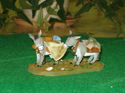 La première représente 2 ânes de transhumance dont l'un tire avec ses dents la couverture de l'âne de devant et les fait glisser de son dos.
